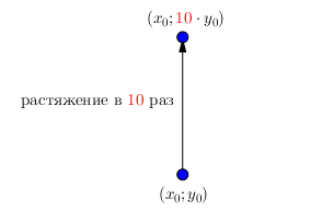 То есть точка \(\displaystyle (x_0;\, \color{red}{ 10}\cdot y_0)\) получена из точки \(\displaystyle (x_0;\,y_0)\) умножением координаты \(\displaystyle y_0 \) на \(\displaystyle \color{red}{ k}=\color{red}{ 10}{\small .}\)
