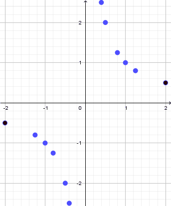 \(\displaystyle \small y=\frac{1}{x}\) | \(\displaystyle \small -0{,}5\) | \(\displaystyle \small -0{,}8\) | \(\displaystyle \small -1\) | \(\displaystyle \small -1{,}25\) | \(\displaystyle \small -2\) | \(\displaystyle \small -2{,}5\) |