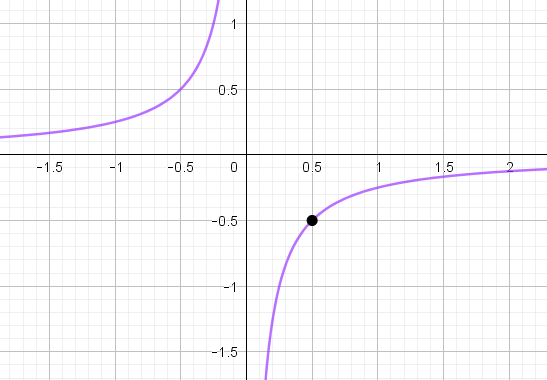 На графике видно, что гипербола \(\displaystyle \rm I\) проходит через точку с координатами \(\displaystyle (0{,}5;\, -0{,}5){\small : }\)