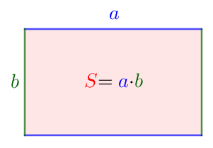 Если длина прямоугольника равна \(\displaystyle \color{blue}{a}\small,\) а ширина – \(\displaystyle \color{green}{b}\small,\) то его площадь \(\displaystyle \color{red}{S}=\color{blue}{a}\cdot\color{green}{b}\small.\)