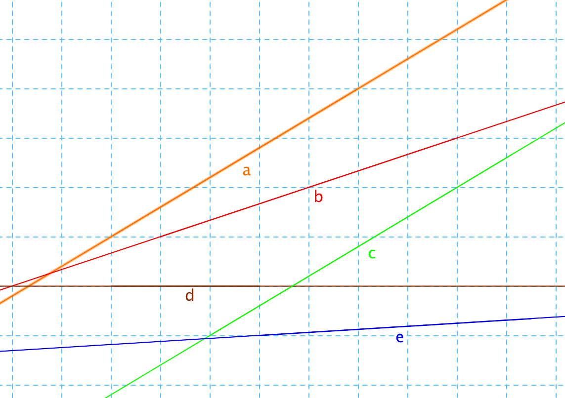 С помощью построения данных прямых в тетради, продлив каждую из них, можно убедиться в том, что с прямой \(\displaystyle a\) пересекаются все прямые за исключением прямой \(\displaystyle c\) (пересечение прямых \(\displaystyle a\) и \(\displaystyle e\) на рисунке не показано, однако видно, что эти прямые пересекаются).