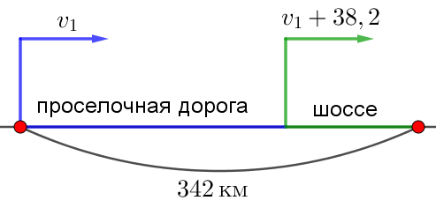 Автомобиль прошел путь в \(\displaystyle 342\) км за \(\displaystyle 5\) часов. Первые три часа он ехал по грунтовой дороге, а следующие два часа по шоссе. Известно, что при движении по шоссе скорость автомобиля была больше на \(\displaystyle 38{,}2\) км/ч, чем при движении по грунтовой дороге.