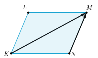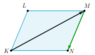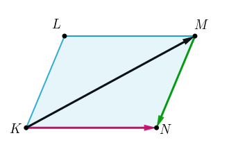 \(\displaystyle \overrightarrow {KM}+\color{#009900}{\overrightarrow {MN}}=\color{#CC0066}{\overrightarrow {KN}}.\)
