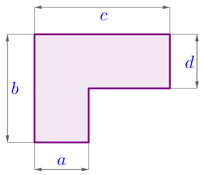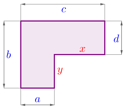 ![]() | На исходном рисунке указаны длины четырёх сторон \(\displaystyle a{\small,}\) \(\displaystyle b{\small,}\) \(\displaystyle c{\small,}\) \(\displaystyle d\) данного шестиугольника. Пусть \(\displaystyle x\) и \(\displaystyle y\) – длины оставшихся двух сторон. Тогда периметр \(\displaystyle P\) шестиугольника равен \(\displaystyle P=a+b+c+d+x+y{\small.}\) |