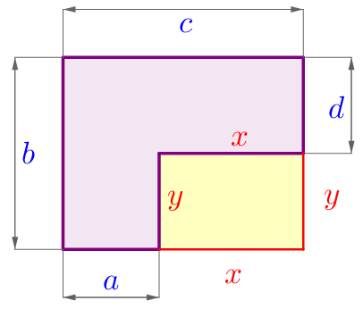 По рисунку видим, что \(\displaystyle \color{blue}{a}+\color{red}{x}=\color{blue}{c}\) и \(\displaystyle \color{blue}{d}+\color{red}{y}=\color{blue}{b}\) – как противоположные стороны прямоугольника.