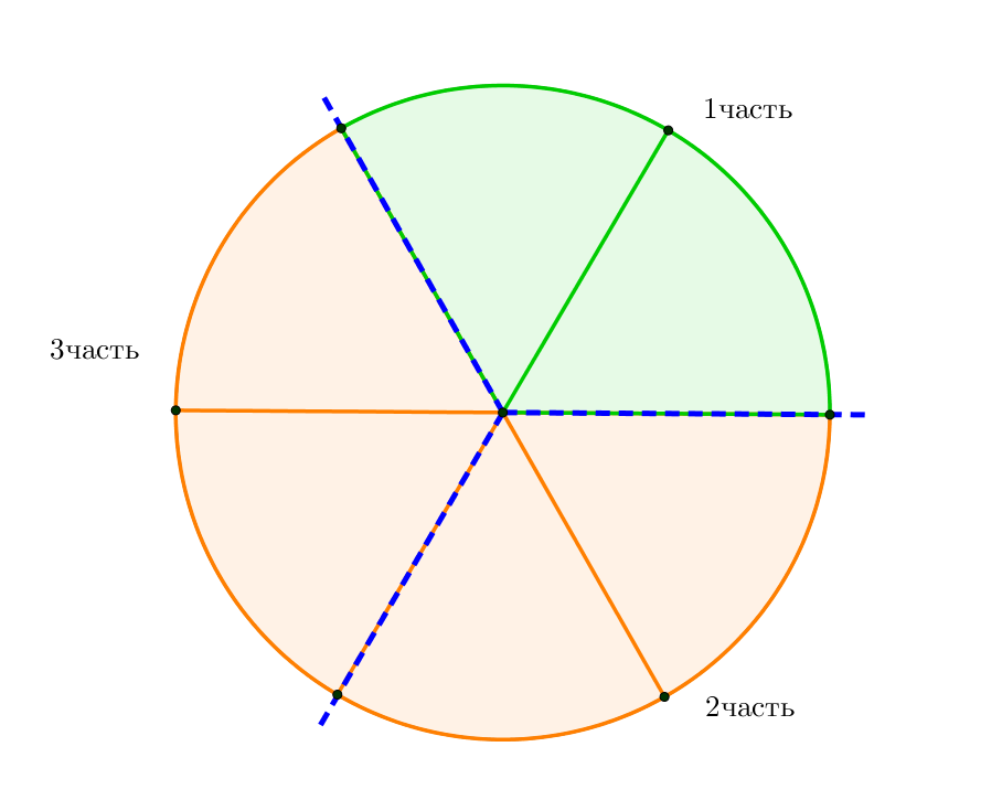 Тогда зелёным закрашена одна из трех равных частей круга. То есть зелёным закрашено \(\displaystyle \frac{2}{6}=\frac{1}{3}\) круга.