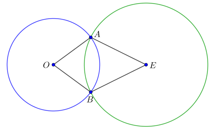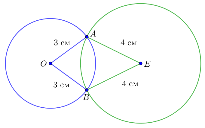 Точка \(\displaystyle O\) – центр синей окружности, точка \(\displaystyle E\) – центр зеленой окружности. Радиус синей окружности равен \(\displaystyle 3\) см, радиус зеленой окружности равен \(\displaystyle 4\) см. Найдите периметр четырехугольника \(\displaystyle OAEB{\small.}\)