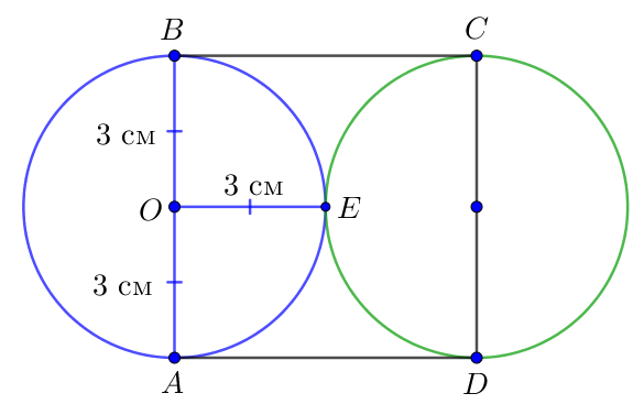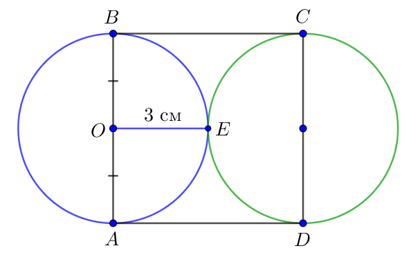 Около квадрата \(\displaystyle ABCD\) построили две окружности. Оказалось, что отрезок \(\displaystyle AB\) – диаметр синей окружности, а \(\displaystyle DC\) – диаметр зеленой окружности. Точка \(\displaystyle O\) делит отрезок \(\displaystyle AB\) на два равных отрезка. Найдите периметр квадрата, если длина отрезка \(\displaystyle OE=3\) см.
