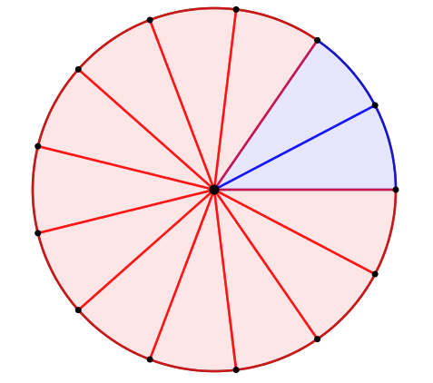 Круг разделен на \(\displaystyle 13\) равных частей, две из них – синие. А какую часть всего круга составляют части, выделенные красным?