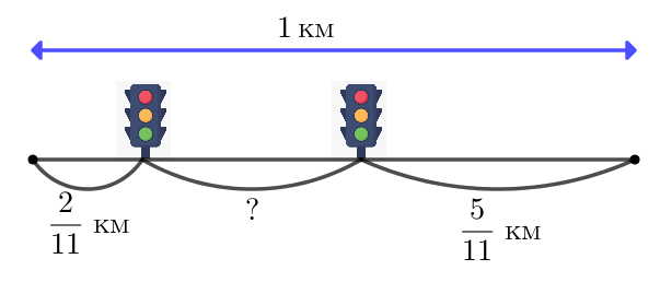 На прямом участке дороги длиной \(\displaystyle 1\) км установлены два светофора. Первый светофор установлен через \(\displaystyle \frac{2}{11}\) км от начала участка. А расстояние между вторым светофором и концом участка составляет \(\displaystyle \frac{5}{11}\) км. Чему равно расстояние между светофорами?