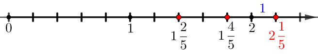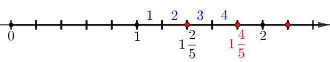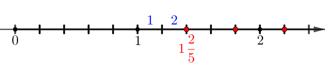 Также первая точка правее \(\displaystyle 1\) на два маленьких отрезка. Значит, дробная часть равна \(\displaystyle \frac{2}{5}\small.\)