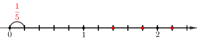 Единичные отрезки разбиты на \(\displaystyle 5\) частей. Значит, длина одной части равна \(\displaystyle \frac{1}{5}\small.\)