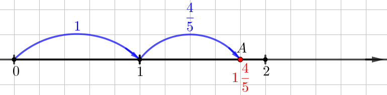 (Между \(\displaystyle 1\) и \(\displaystyle 2\) пять клеток, значит, чтобы отложить \(\displaystyle \frac{4}{5}\small,\) нужно взять \(\displaystyle 4\) клетки.)