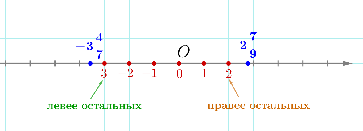 Какое целое число находится левее остальных на координатной прямой между числами \(\displaystyle -3{\small\frac{4}{7}}\) и \(\displaystyle 2{\small\frac{7}{9}}\small{?}\)