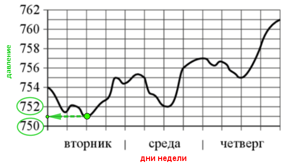 Значит, этой отметке соответствует значение \(\displaystyle \color{LimeGreen} {751}\) мм рт. ст.