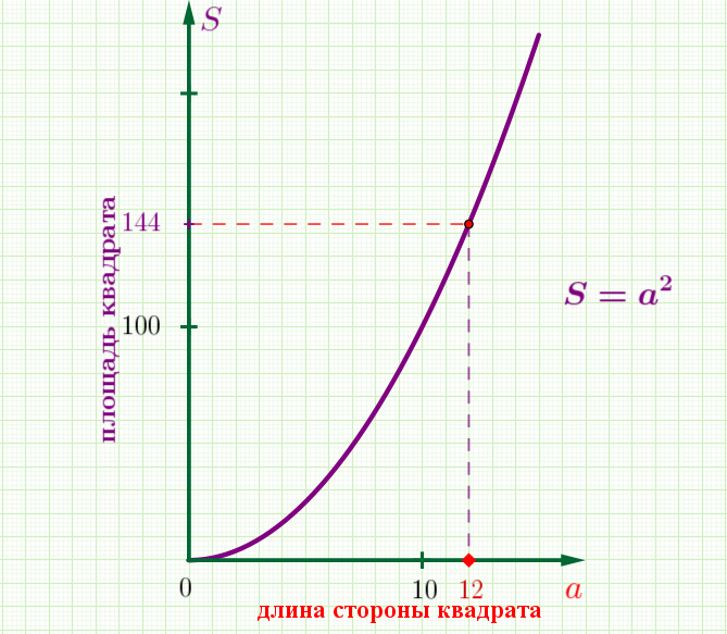 Определите по графику площадь квадрата со стороной, равной \(\displaystyle 12{\small.}\)