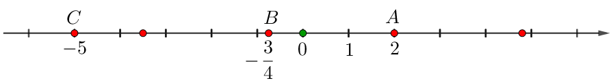 Отметим точку \(\displaystyle B\) с координатой \(\displaystyle -\frac{3}{4}{\small.}\) Для этого отложим \(\displaystyle \frac{3}{4}\) отрезка в отрицательном направлении: