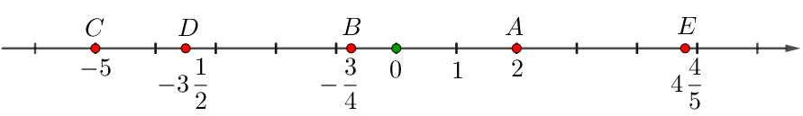 Отметим точку \(\displaystyle E\) с координатой \(\displaystyle 4\frac{4}{5}{\small.}\) Для этого отложим \(\displaystyle 4\) целых и еще \(\displaystyle \frac{4}{5}\) отрезка в положительном направлении.