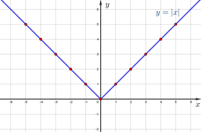 | \(\displaystyle y=|x|\) | \(\displaystyle \small 0\) | \(\displaystyle \small 1\) | \(\displaystyle \small 2\) | \(\displaystyle \small 3\) | \(\displaystyle \small 4\) | \(\displaystyle \small 5\) |