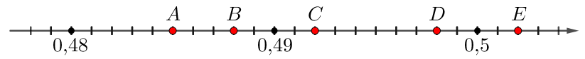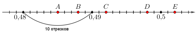 - точка \(\displaystyle D\) удалена от \(\displaystyle 0{,}49\) на \(\displaystyle 8\) отрезков, значит, координата \(\displaystyle D\) равна \(\displaystyle 0{,}498\small,\)