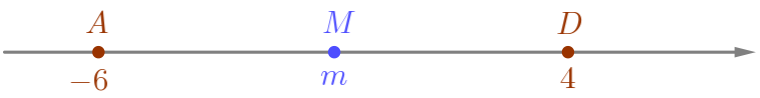 - Точка \(\displaystyle M\) делит отрезок \(\displaystyle AD\) пополам. Значит, расстояние от точки \(\displaystyle A(-6)\) до точки \(\displaystyle M(m)\) равно \(\displaystyle 10:2=5{\small.}\)
