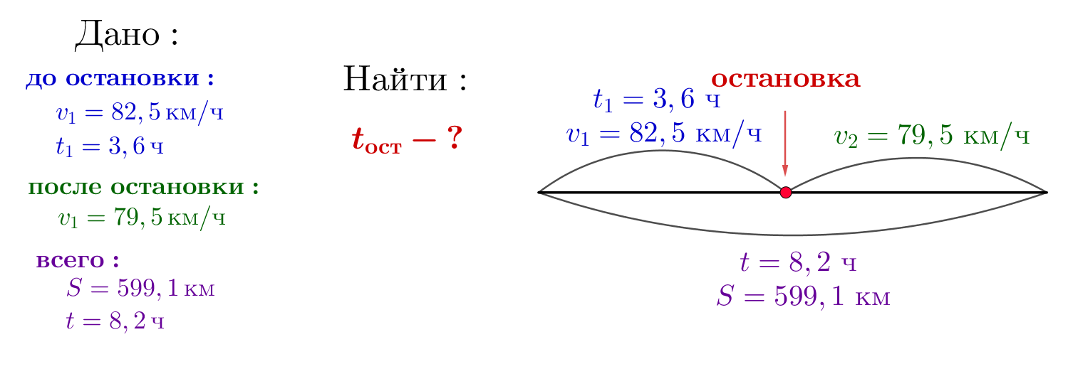 Таким образом, общее время в пути – \(\displaystyle 8{,}2\)ч, до остановки – \(\displaystyle 3{,}6\)ч, после остановки – \(\displaystyle 3{,}8\)ч. Тогда остановка длилась: