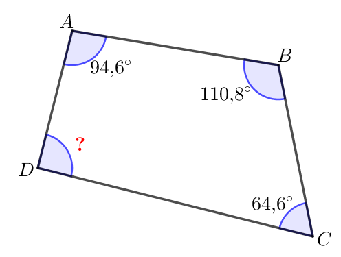 \(\displaystyle \angle D=360^{\circ}-94{,}6^{\circ}-110{,}8^{\circ}-64{,}6^{\circ}=90^{\circ}\small.\)
