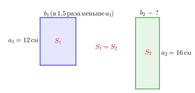 1. По условию, длина первого прямоугольника \(\displaystyle \color{blue}{a_{1}}=12\)см, а его ширина в \(\displaystyle 1{,}5\) раза меньше. То есть равна