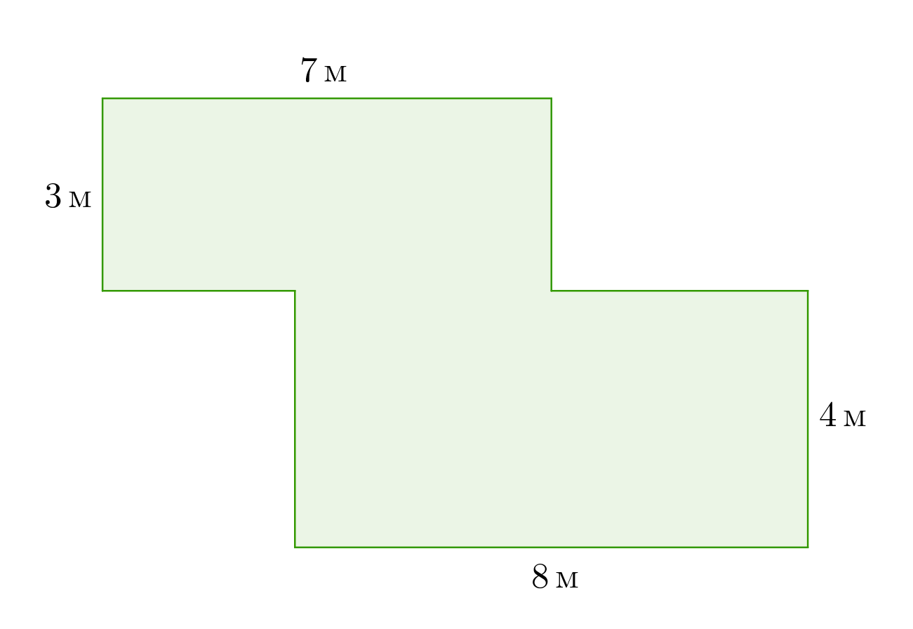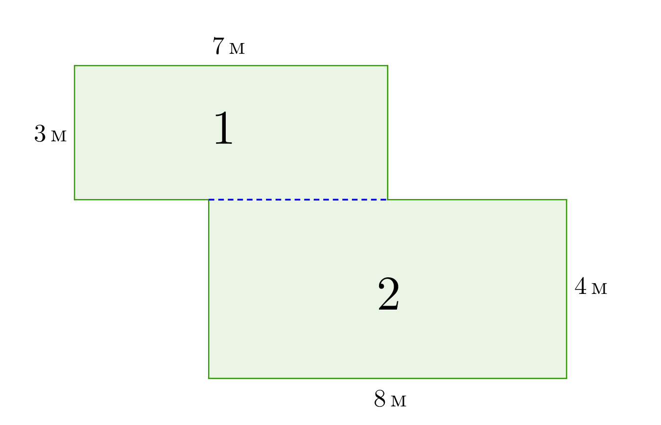 \(\displaystyle \color{green}{S}=\color{red}{S_{1}}+\color{red}{S_{2}}=21+32=53\)м2.