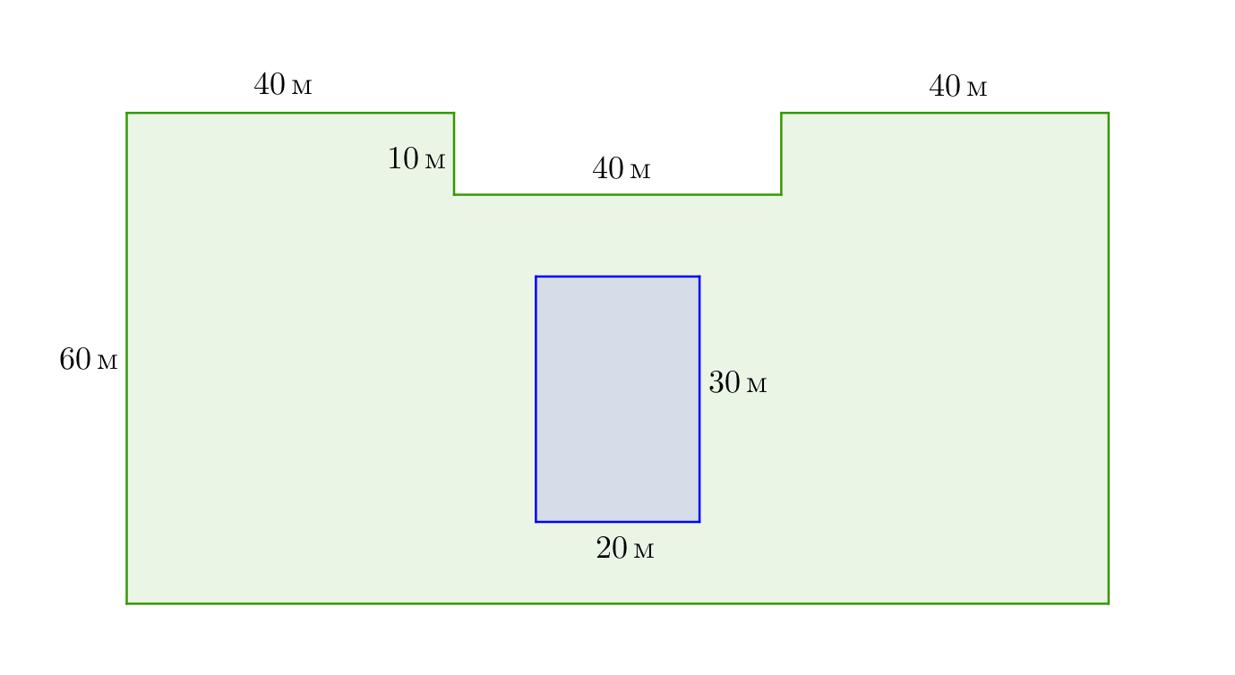 Участок, изображенный на рисунке, планируют покрыть газоном. В центре участка находится пруд прямоугольной формы. На какую площадь планируют высадить газон, если нужно покрыть весь участок, кроме пруда?