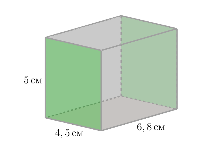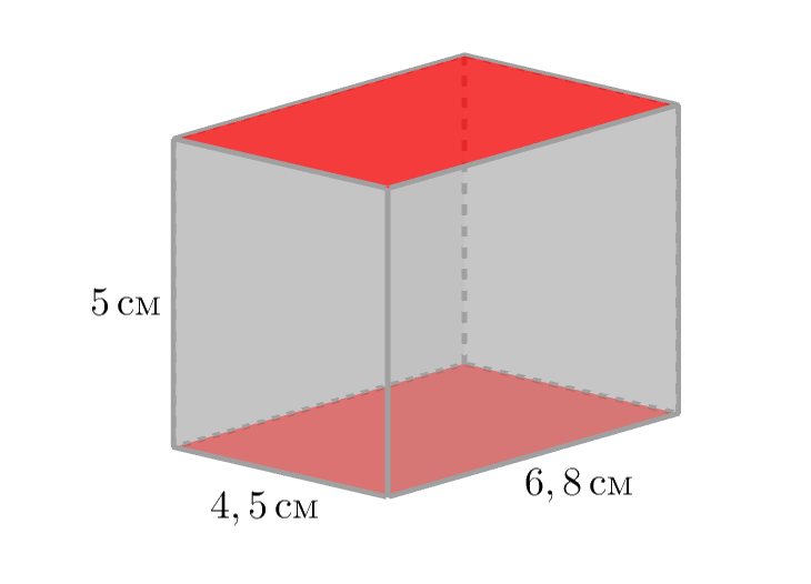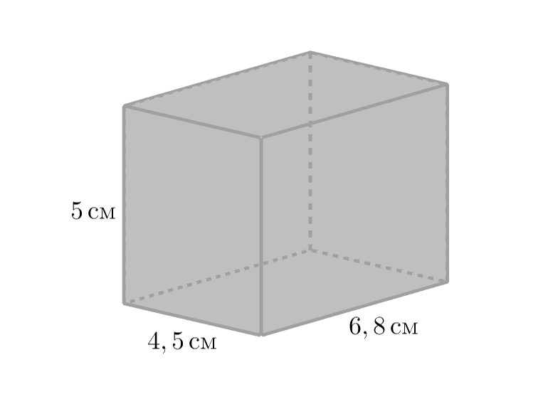 Блок в форме прямоугольного параллелепипеда, измерения которого равны \(\displaystyle 5\)см, \(\displaystyle 4{,}5\)см и \(\displaystyle 6{,}8\)см, необходимо покрасить со всех сторон в один слой. Сколько грамм краски потребуется, если на окраску \(\displaystyle 5\)см2 расходуется \(\displaystyle 4\)г краски?