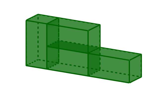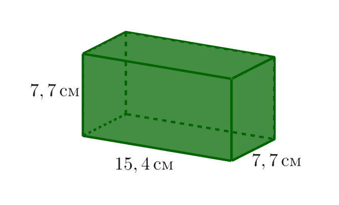 Тогда площадь поверхности всей фигуры, склеенной из блоков, равна сумме четырех площадей квадрата со стороной \(\displaystyle 7{,}7\)см и тринадцати площадей прямоугольника со сторонами \(\displaystyle 15{,}4\)см и \(\displaystyle 7{,}7\)см: