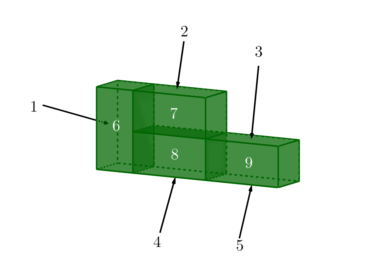 \(\displaystyle 9\) из них обозначены на рисунке. Еще \(\displaystyle 4\) грани расположены так же, как и грани с номерами \(\displaystyle 6\small,\) \(\displaystyle 7\small,\) \(\displaystyle 8\) и \(\displaystyle 9\small,\) но на задней стенке фигуры: