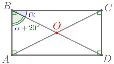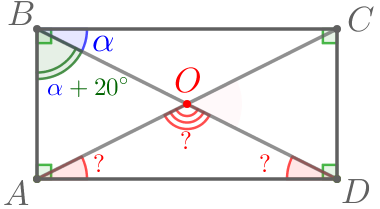 Диагонали \(\displaystyle AC\) и \(\displaystyle BD\) прямоугольника \(\displaystyle ABCD\) пересекаются в точке \(\displaystyle O{\small,}\) угол \(\displaystyle ABD\) больше угла \(\displaystyle CBD\) на \(\displaystyle 20^{\circ}{\small.}\) Найдите углы треугольника \(\displaystyle AOD{\small.}\)