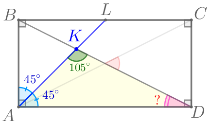 \(\displaystyle \angle ADK=180^{\circ}-(105^{\circ}+45^{\circ})=180^{\circ}-150^{\circ}=30^{\circ}{\small.}\)