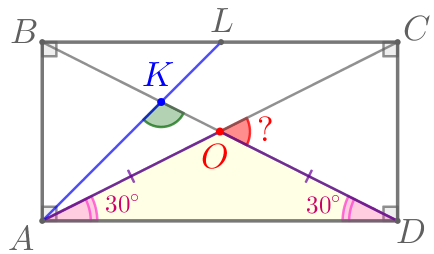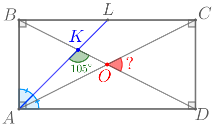 В прямоугольнике \(\displaystyle ABCD\) \(\displaystyle AB<BC{\small,}\) биссектриса угла \(\displaystyle A\) образует с диагональю \(\displaystyle BD\) углы, один из которых равен \(\displaystyle 105^{\circ}{\small.}\) Найдите меньший угол между диагоналями данного прямоугольника.