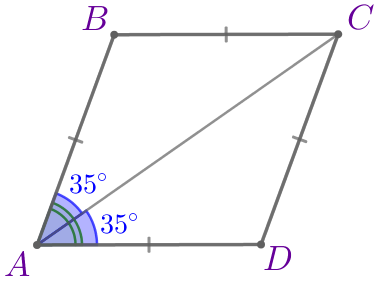 По свойству ромба диагональ \(\displaystyle AC\) делит угол \(\displaystyle A\) пополам, значит, \(\displaystyle \angle BAC = \angle DAC = \frac{1}{2} \angle A=\frac{1}{2} \cdot 70^{\circ} =35^{\circ}{\small.}\) | ![]() |