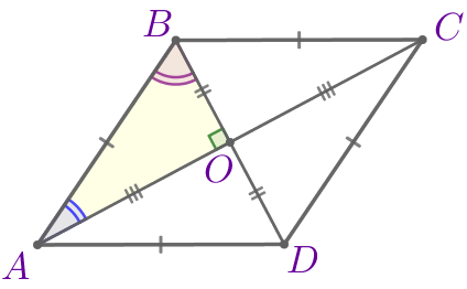 Значит, нужно найти угол между диагональю \(\displaystyle AC\) и стороной ромба.