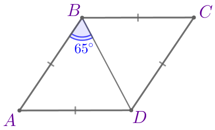 В ромбе \(\displaystyle ABCD\) угол между диагональю и стороной равен \(\displaystyle 65^{\circ}{\small.}\) Найдите острый угол ромба. Ответ дайте в градусах.