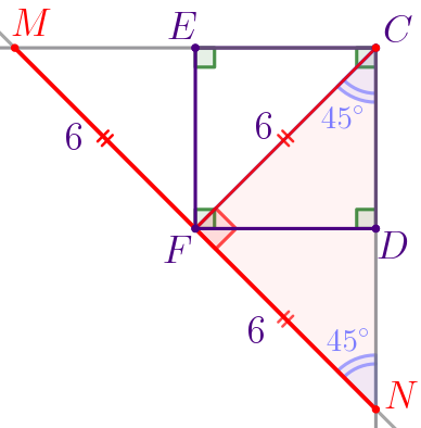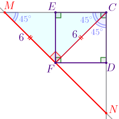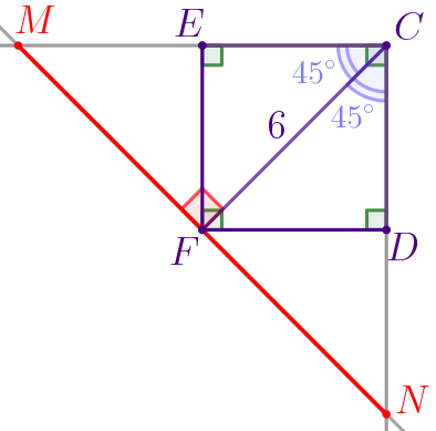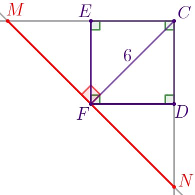 Диагональ \(\displaystyle FC\) квадрата \(\displaystyle FECD\) равна \(\displaystyle 6\, \footnotesize см{\small.}\) Прямая, проходящая через точку \(\displaystyle F\) и перепендикулярная к прямой \(\displaystyle FC{\small,}\) пересекает прямые \(\displaystyle EC\) и \(\displaystyle CD\) соответственно в точках \(\displaystyle M\) и \(\displaystyle N{\small.}\) Найдите \(\displaystyle MN{\small.}\)