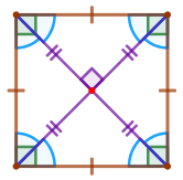 ![]() | \(\displaystyle 1.\) Все углы квадрата прямые. \(\displaystyle 2.\) Диагонали квадрата равны, взаимно перпендикулярны, точкой пересечения делятся пополам и делят углы квадрата пополам. |