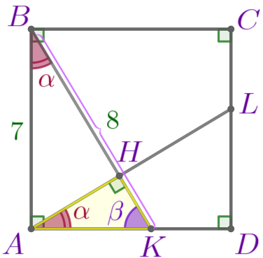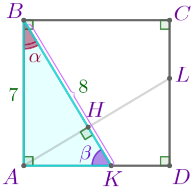 На сторонах \(\displaystyle AD\) и \(\displaystyle CD\) квадрата \(\displaystyle ABCD\) отметили соответственно точки \(\displaystyle K\) и \(\displaystyle L\) так, что \(\displaystyle BK \perp AL{\small.}\) Найдите длину отрезка \(\displaystyle AL{\small,}\) если \(\displaystyle AB=7{\small,}\) \(\displaystyle BK=8{\small.}\)