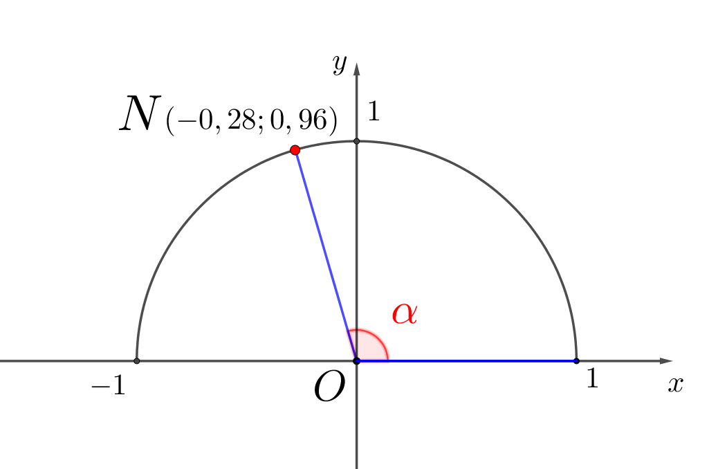 На рисунке изображена единичная полуокружность, и отмечена точка\(\displaystyle N\small.\) Координаты точки \(\displaystyle N\) – \(\displaystyle (-0{,}28; 0{,}96) \small.\) Чему равны синус и косинус угла \(\displaystyle \color{red}{\alpha}\small{?}\)