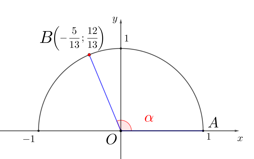 На рисунке изображена единичная полуокружность. Чему равен тангенс угла \(\displaystyle AOB\small,\) если координаты точки \(\displaystyle B\) равны \(\displaystyle \left( -\frac{5}{13} ;\, \frac{12}{13} \right) \small{?}\)