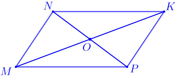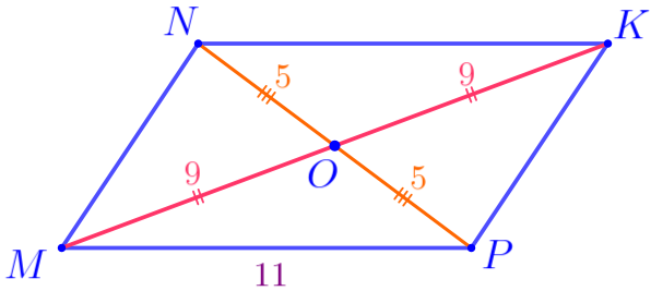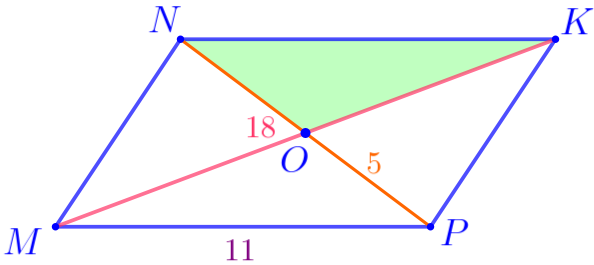 Диагонали параллелограмма \(\displaystyle MNKP\) пересекаются в точке \(\displaystyle O{\small.}\) Найдите периметр треугольника \(\displaystyle ONK{\small,}\) если \(\displaystyle MK=18\, {\footnotesize см}{\small,}\) \(\displaystyle OP=5\, {\footnotesize см}{\small,}\) \(\displaystyle MP=11\, {\footnotesize см}{\small.}\)