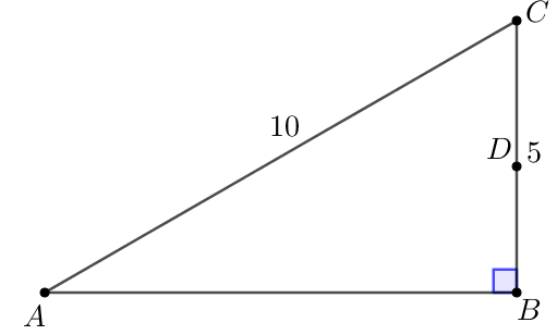 \(\displaystyle AB=\sqrt{AC^2-BC^2}=\sqrt{10^2-5^{2}}=5\sqrt{3}\small.\)