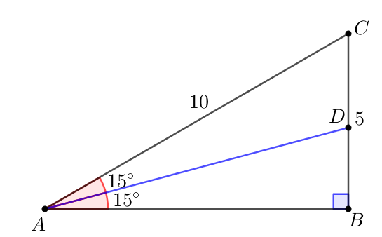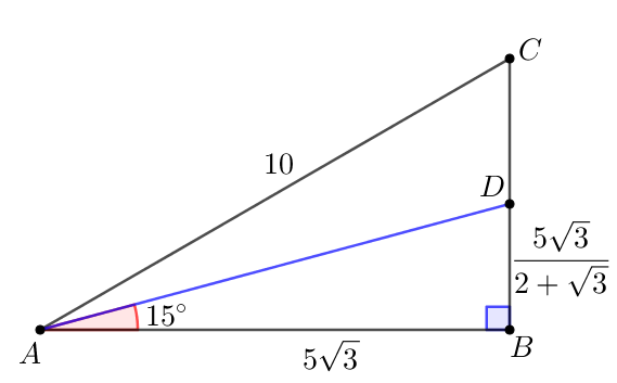 Теперь рассмотрим треугольник \(\displaystyle ADB\small.\) Котангенс угла равен отношению прилежащего катета к противолежащему: \(\displaystyle \ctg\angle DAB=\ctg15^{\circ}=\frac{AB}{DB}=\frac{5\sqrt{3}}{\frac{5\sqrt{3}}{2+\sqrt{3}}}=2+\sqrt{3}\small.\) |