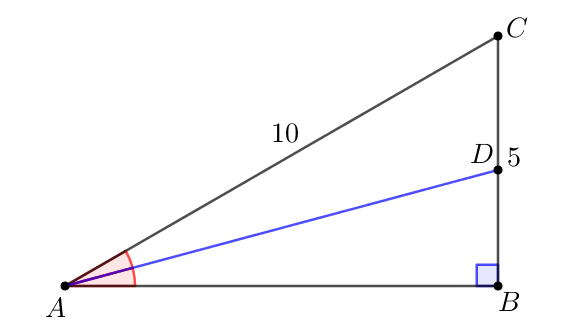 В прямоугольном треугольнике \(\displaystyle ACB\) гипотенуза \(\displaystyle AC=10\) в два раза больше катета \(\displaystyle BC=5\small.\) Тогда это прямоугольный треугольник с углами \(\displaystyle 30^{\circ},\,60^{\circ},\,90^{\circ}\small.\) Причем угол \(\displaystyle 30^{\circ}\) лежит напротив катета, равного половине гипотенузы. То есть \(\displaystyle \angle CAB=30^{\circ}\small.\) | |