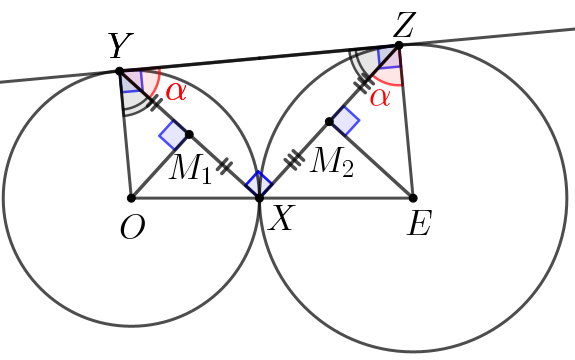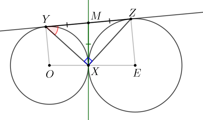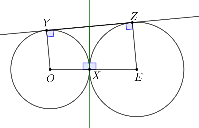 Сразу отметим, что касательная к окружности перпендикулярна радиусу, проведённому в точку касания. То есть \(\displaystyle \angle OYZ=\angle EZY=90^{\circ}\small.\) Отрезки \(\displaystyle OX\) и \(\displaystyle EX\) перпендикулярны общей касательной к окружностям. Тогда \(\displaystyle O,\,X,\,E\) лежат на одной прямой. | ![]() |
