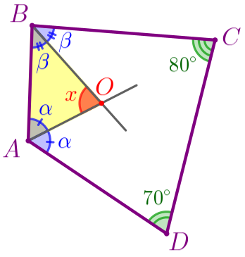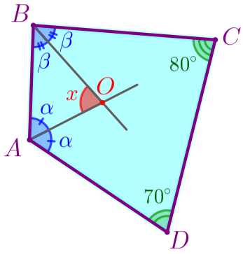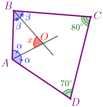 В выпуклом четырёхугольнике \(\displaystyle ABCD{\small:}\) \(\displaystyle \angle A+\angle B+\angle C+\angle D=360^{\circ}{\small.} \) То есть \(\displaystyle 2\color{blue}{\alpha}+2\color{blue}{\beta}+\color{green}{80^{\circ}}+\color{green}{70^{\circ}}=360^{\circ}{\small.} \) Получаем: \(\displaystyle 2(\color{blue}{\alpha}+\color{blue}{\beta})=360^{\circ}-\color{green}{80^{\circ}}-\color{green}{70^{\circ}}{\small;} \) \(\displaystyle 2(\color{blue}{\alpha}+\color{blue}{\beta})=210^{\circ}{\small;} \) \(\displaystyle \color{blue}{\alpha}+\color{blue}{\beta}=105^{\circ}{\small.} \) | ![]() |